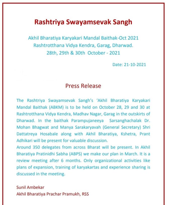 Rashtriya Swayamsevak Sangh’s ‘Akhil Bharatiya Karyakari Mandal Baithak (ABKM) is to be held on October 28, 29 and 30 at Rashtrotthana Vidya Kendra, Madhav Nagar, Garag in the outskirts of Dharwad.