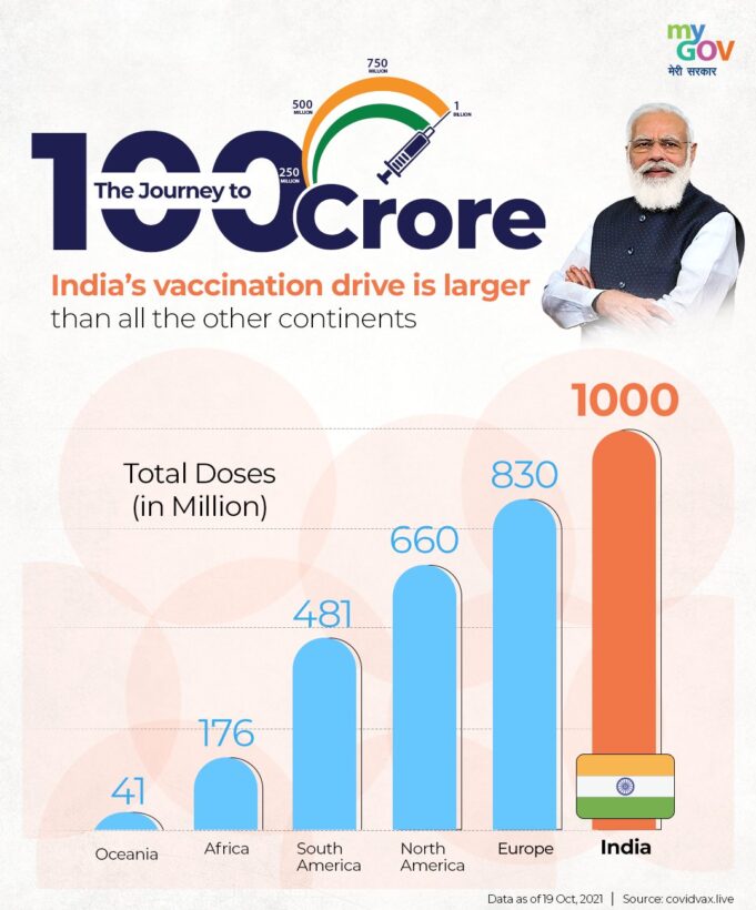 కరోనాపై పోరాటంలో భారత్ అసాధారణ మైలురాయిని అందుకున్నది. నేటి వరకు దేశవ్యాప్తంగా వంద కోట్ల కోవిడ్ టీకా డోసులను పంపిణీ చేశారు. 2021 జనవరి 16న వ్యాక్సినేషన్ ప్రారంభమైనప్పటి నుంచి గురువారం ఉదయం 10 గంటల వరకు 100 కోట్ల వ్యాక్సిన్ డోసులను ప్రజలకు ఇచ్చినట్లు ప్రభుత్వం ప్రకటించింది. ఇది అమెరికాలో ఇచ్చిన వ్యాక్సిన్...