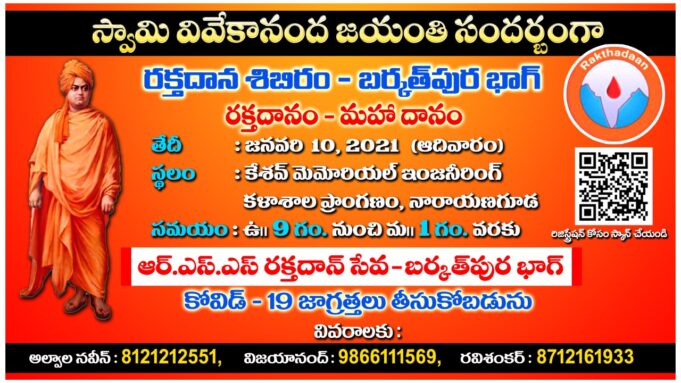 స్వామి వివేకానంద జయంతిని పురస్కరించుకొని రక్తదాన్ సేవ ట్రస్ట్ - తెలంగాణ వారి సౌజన్యంతో జనవరి 10 2021 ఆదివారం రోజున రక్తదాన్ సేవ, బర్కత్ పుర భాగ్ నారాయణగూడ లోని శ్రీ కేశవ్ మెమోరియల్ ఇంజనీరింగ్ కళాశాల ప్రాంగణం లో రక్తదాన శిబిరం నిర్వహించనున్నారు. ఈ శిబిరం ద్వారా సేకరించిన రక్తాన్ని గాంధీ...