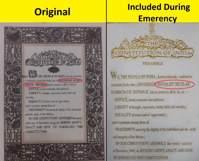 రాజ్యాంగ పీఠిక నుంచి 'సోషలిస్ట్', 'సెక్యులర్' పదాలను తొలగించాలని కోరుతూ సుప్రీంకోర్టులో పిటిషన్ దాఖలైంది. ఈ రెండు పదాలు 1977 ఎమర్జెన్సీ సమయంలో అప్రజాస్వామికంగా, పార్లమెంటులో ఎలాంటీ చర్చ లేకుండా ప్రతిపక్ష నాయకులందరూ జైల్లో ఉన్నప్పుడు చేర్చారనీ, వీటిని తొలగించాలని న్యాయవాదులు బలరాం సింగ్, కరుణేశ్ కుమార్ శుక్ల, విష్ణు శంకర్ జైన్ సుప్రీం కోర్టులో పిటిషన్ దాఖలు చేశారు.