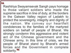 దేశ సమైక్యత, సార్వభౌమత్వం, గౌరవాలను కాపాడేందుకు లడఖ్ ప్రాంతంలోని గాల్వన్ లోయలో విధినిర్వహణలో సర్వోన్నతమైన త్యాగాన్ని చేసిన వీరులైన సైనికులకు రాష్ట్రీయ స్వయంసేవక్ సంఘ్ శ్రద్ధాంజలి ఘటిస్తోంది. భారత ప్రజానీక తరఫున అమరులైన...