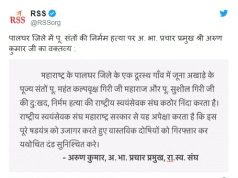 పాల్ఘర్ జిల్లాలో పూజ్య సంత్ ల ఘోరమైన హత్య గురించి ఆర్ ఎస్ ఎస్ అఖిల భారతీయ ప్రచార ప్రముఖ్ శ్రీ అరుణ్ కుమార్ ప్రకటన;